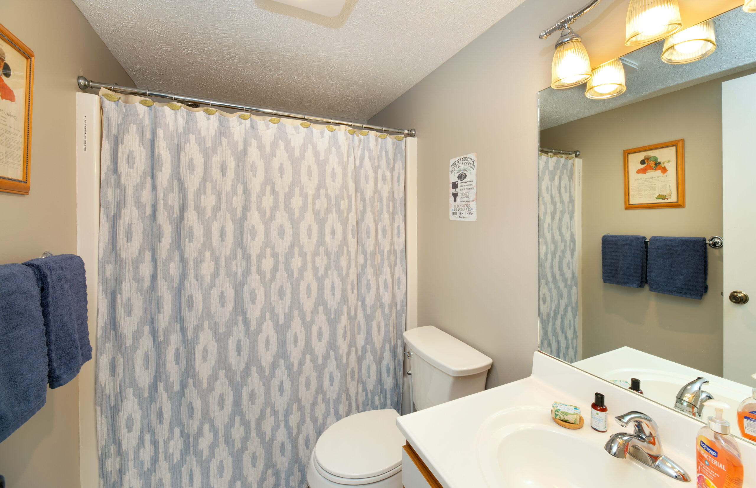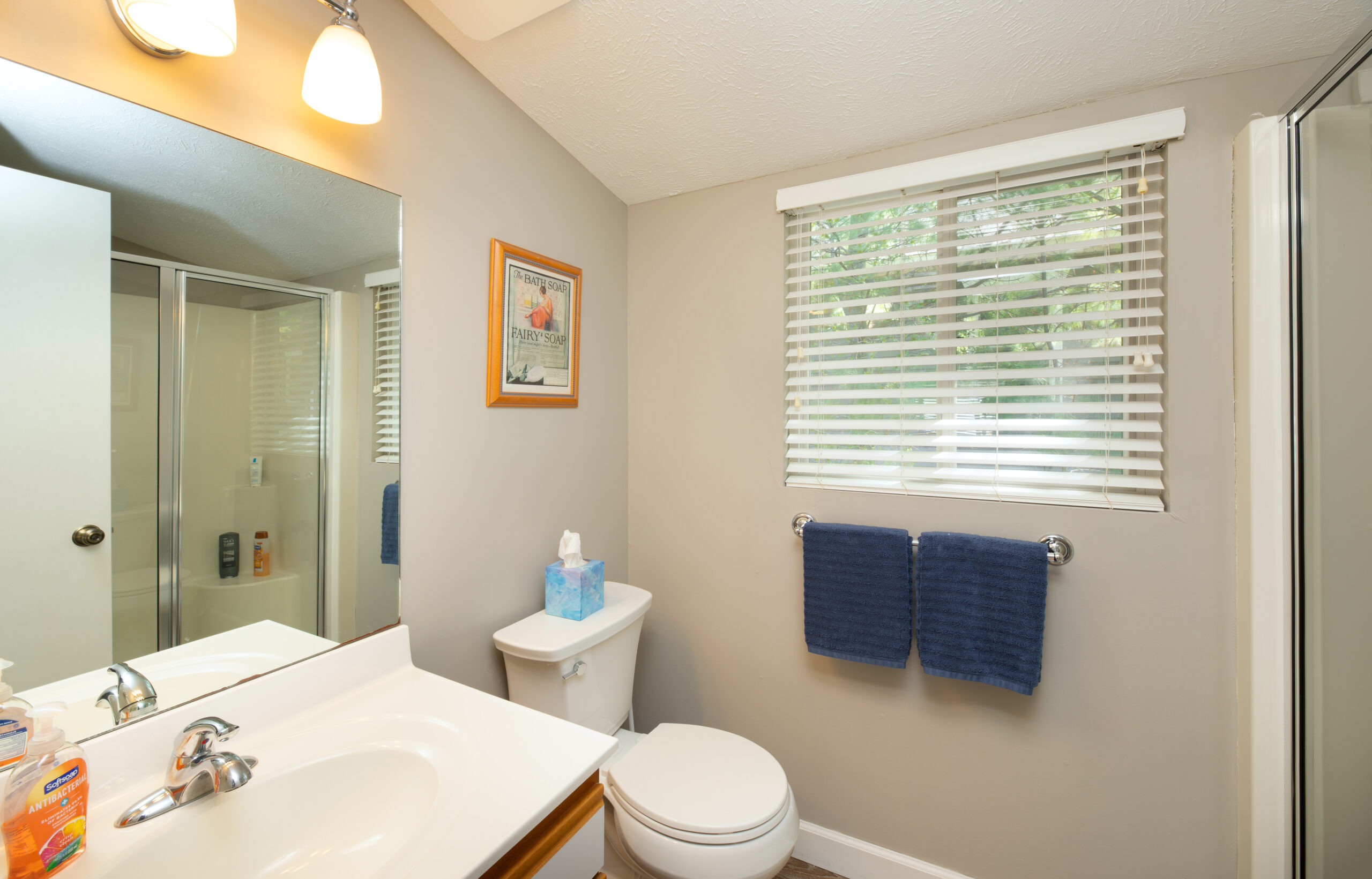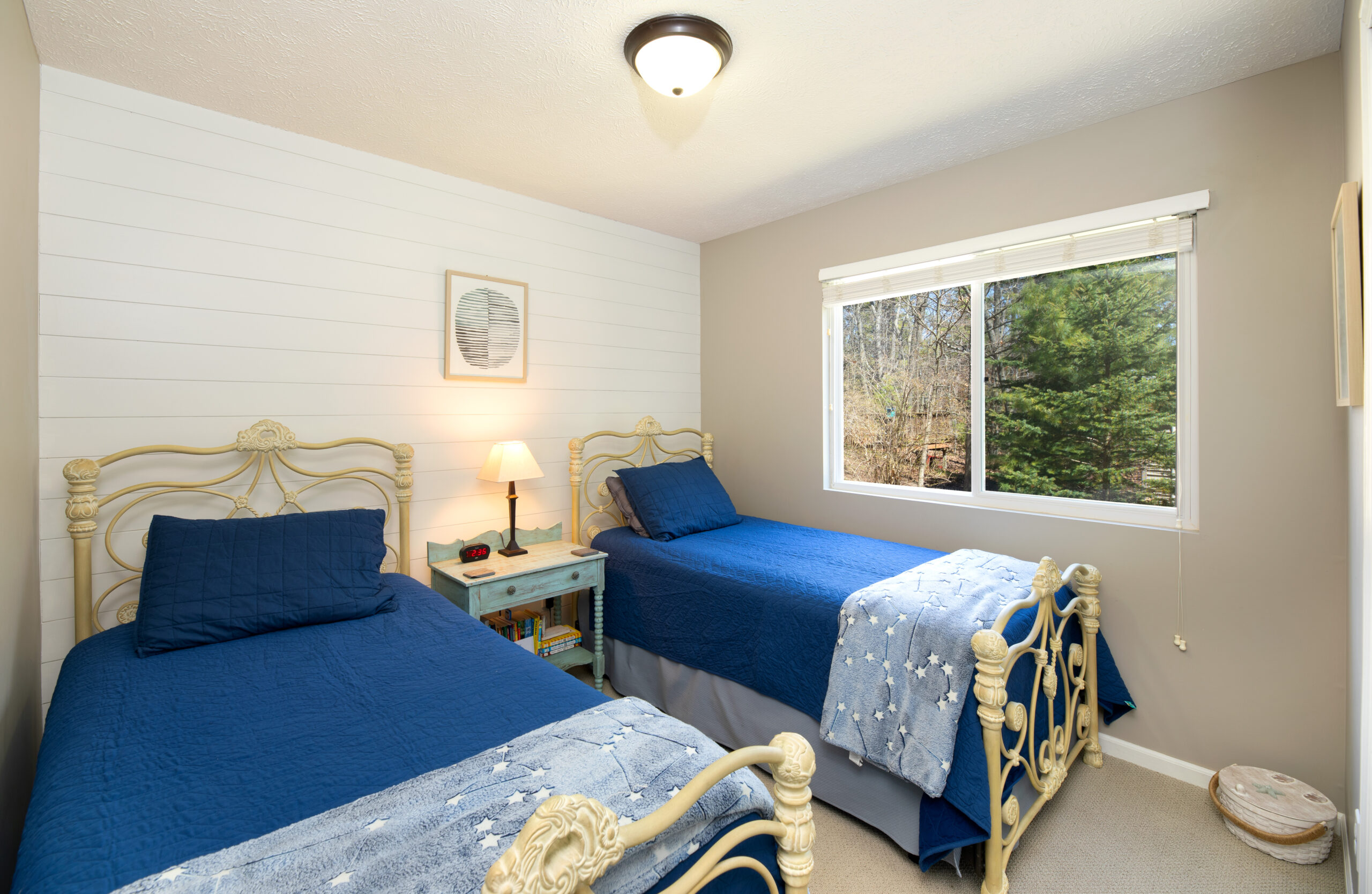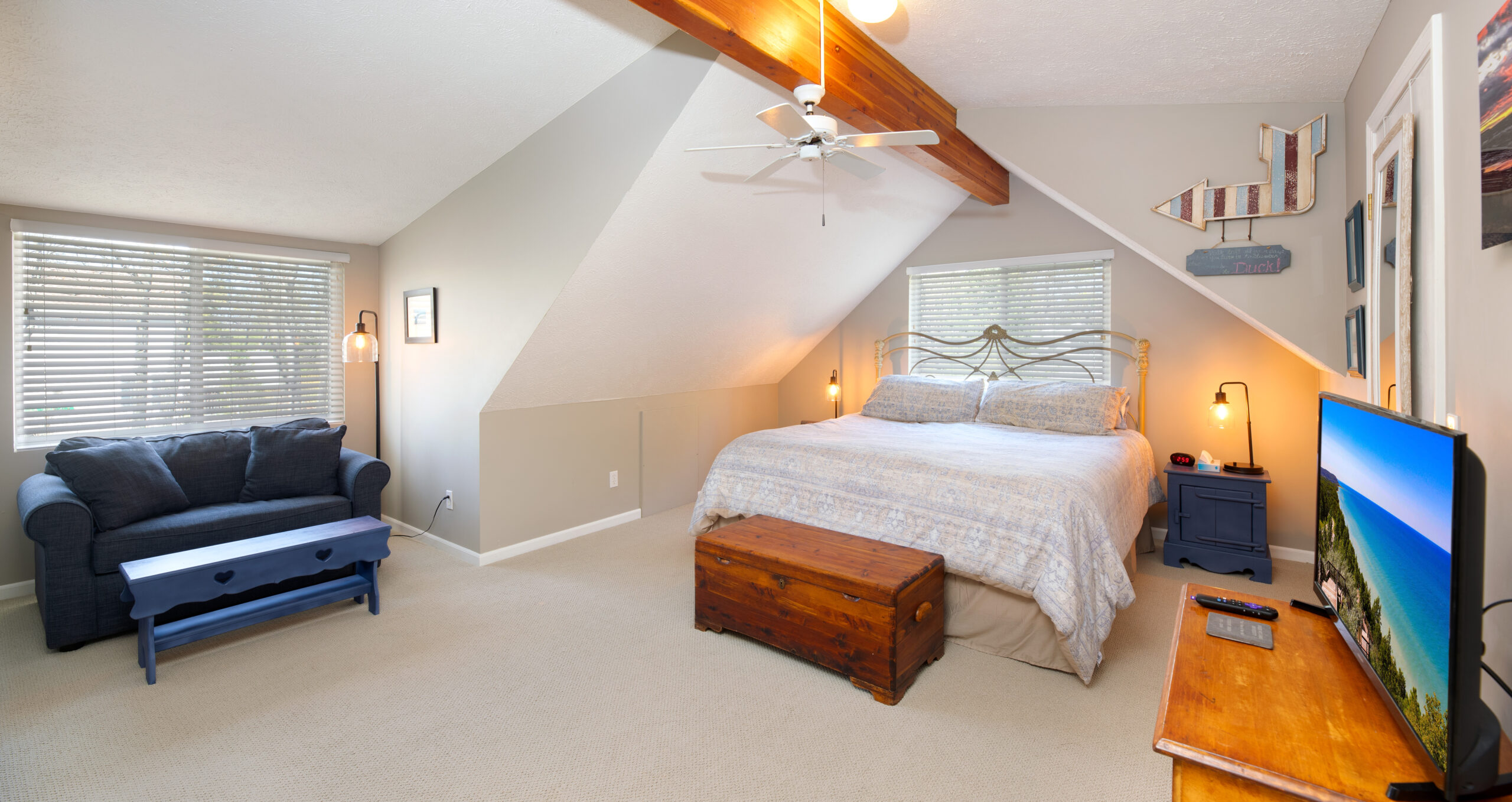 Main suite has a king bed and bath with shower. Second bedroom has a queen and third bedroom has 2 twins. Another full bath on the main level.