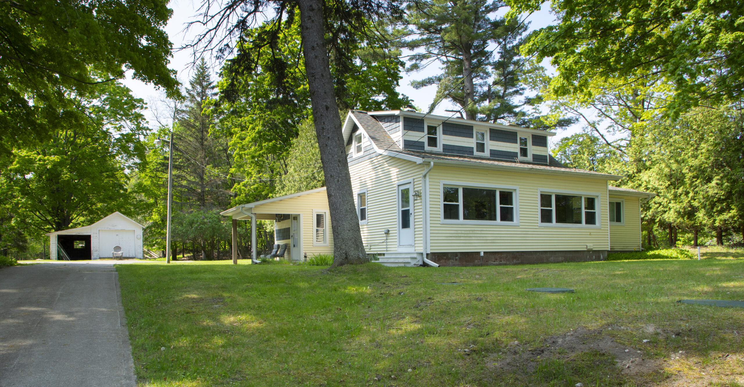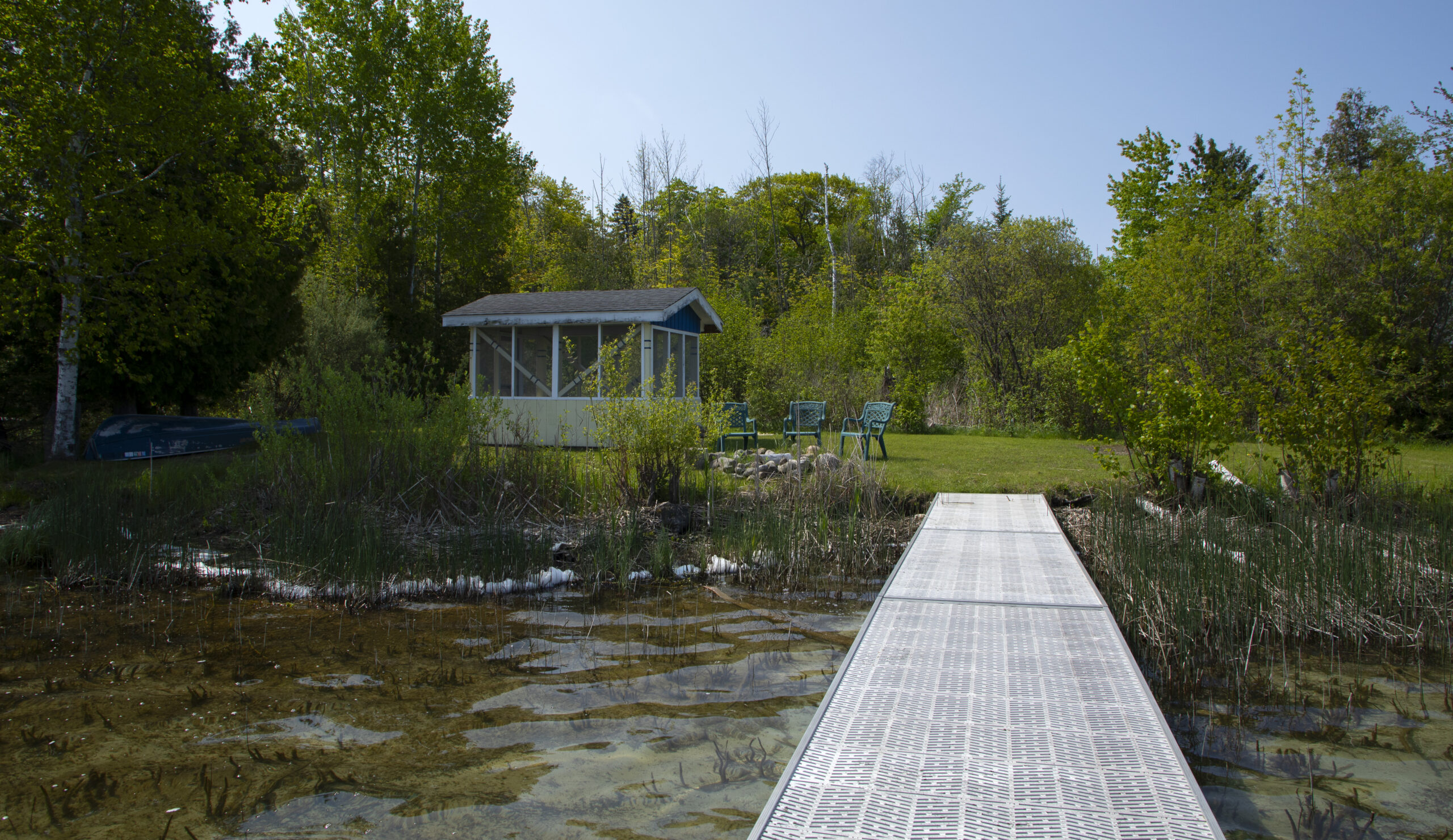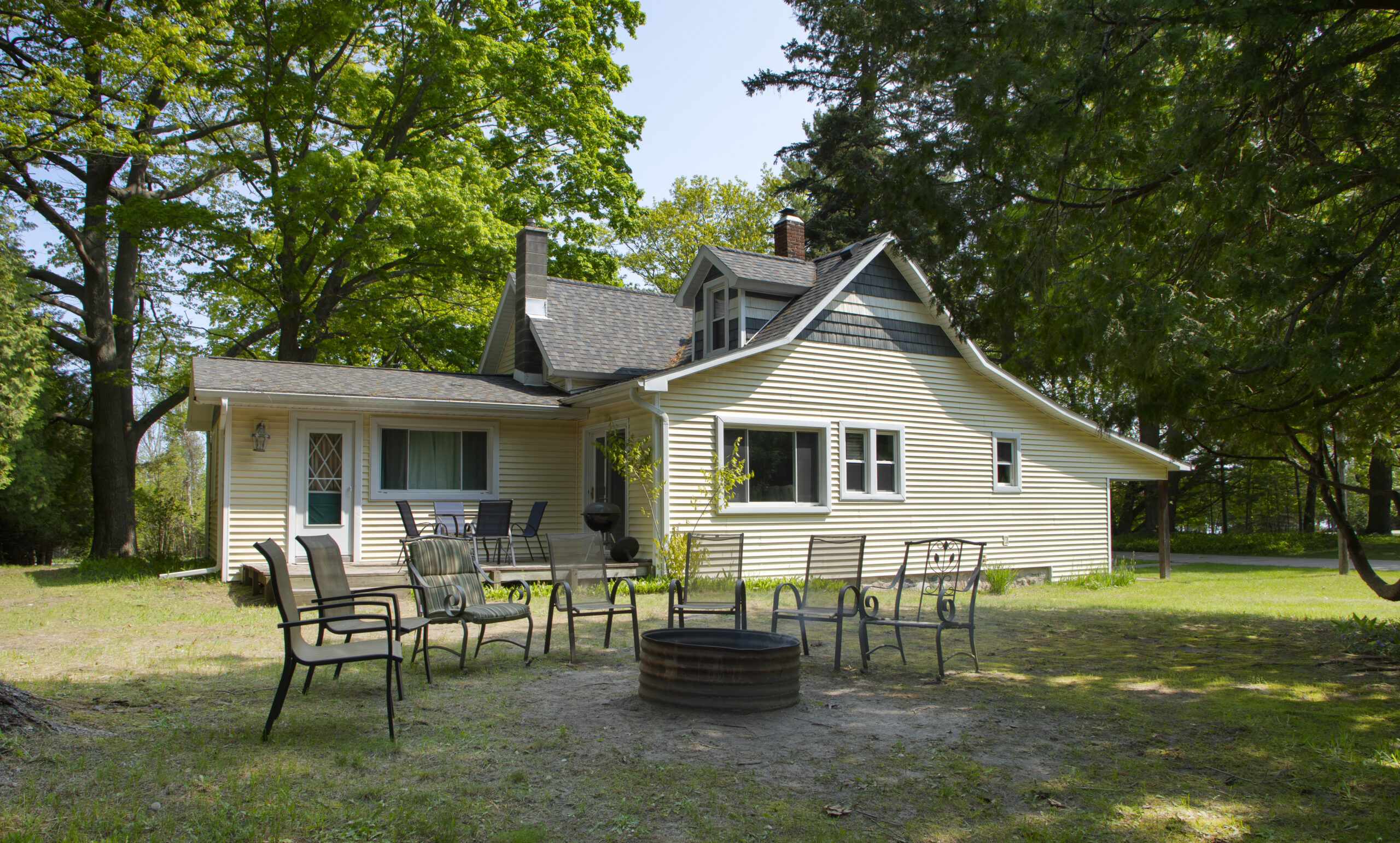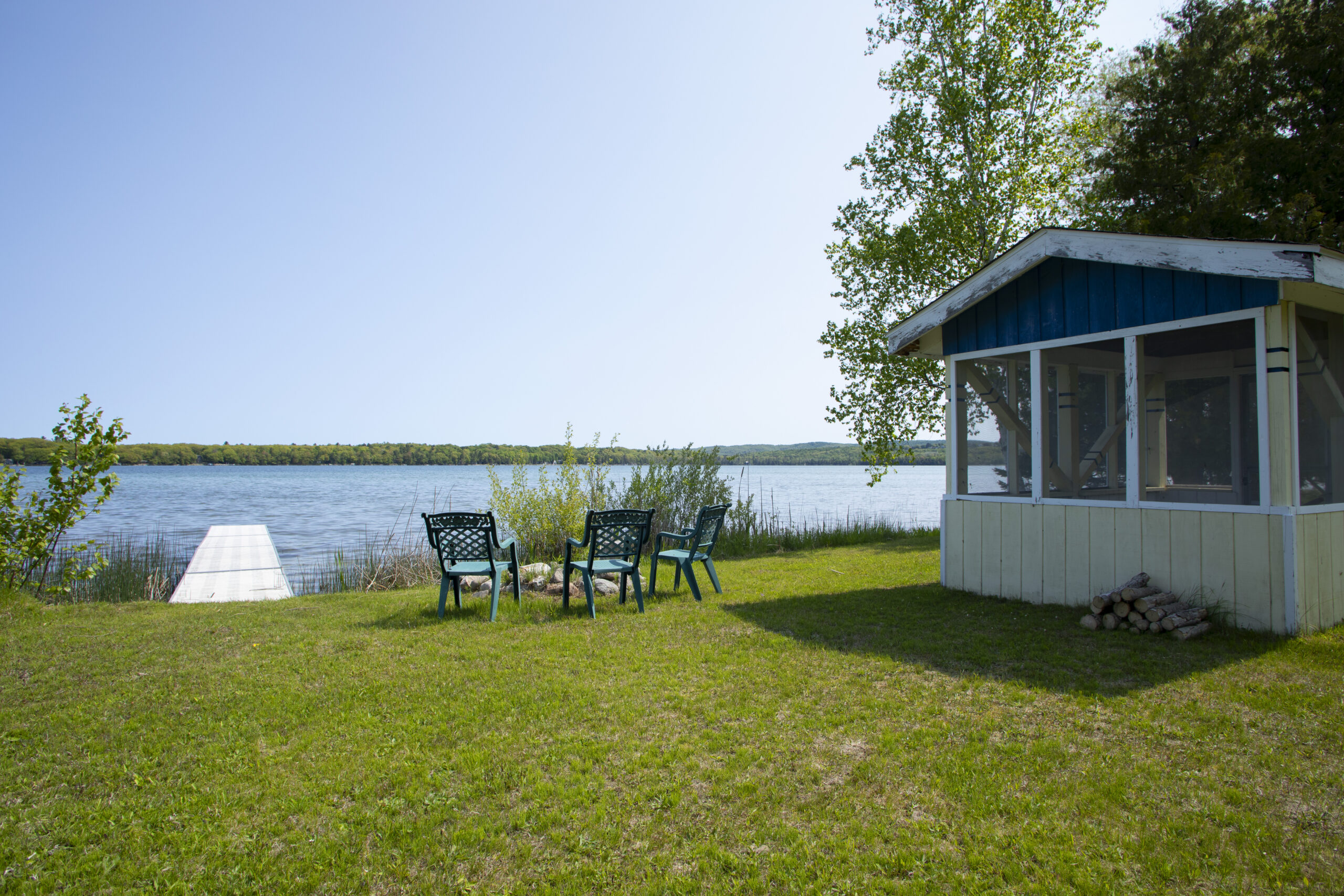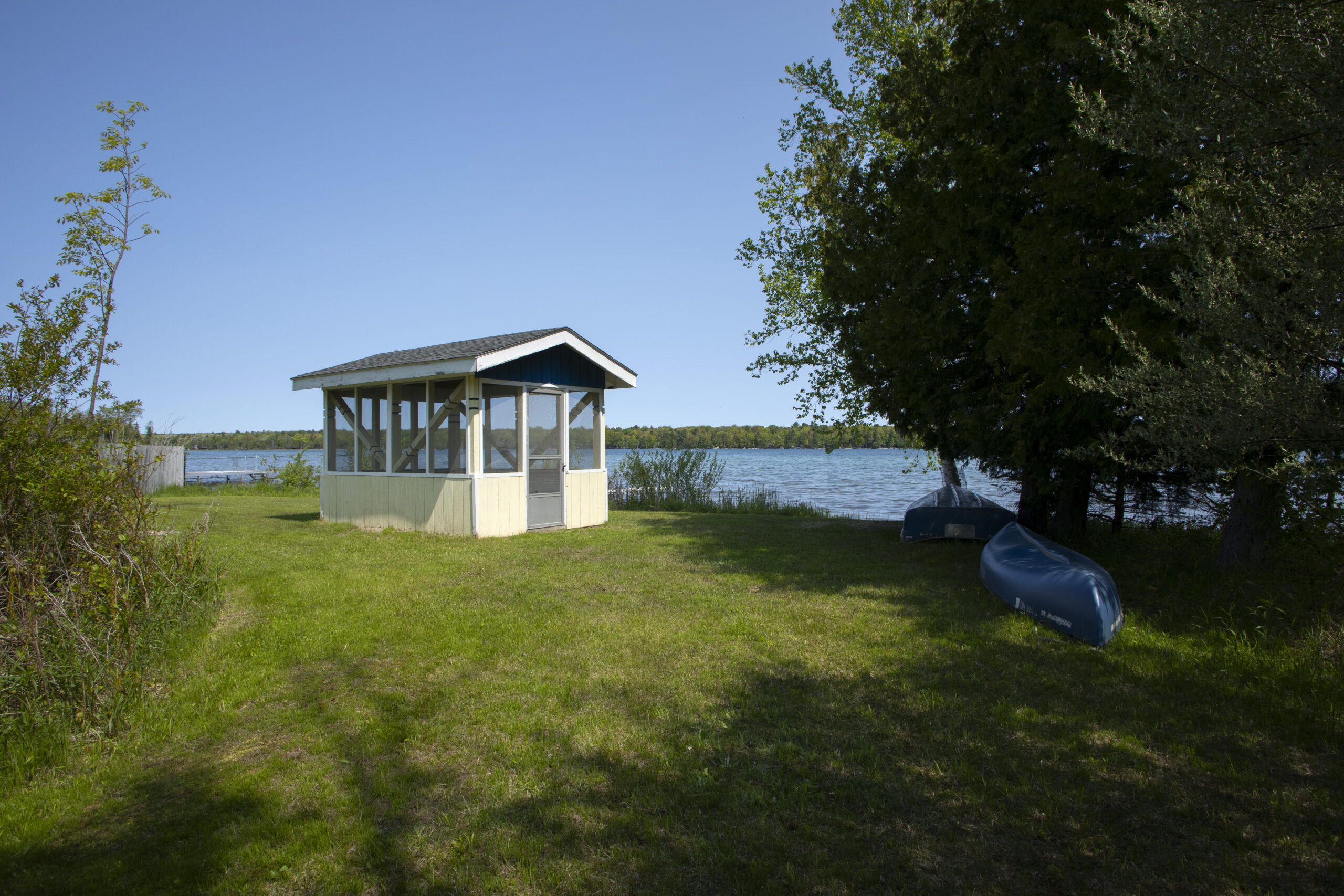 Across the road sits a picturesque scene with 100 feet of frontage on Little Traverse Lake, with enough space for family picnics and recreational activities. The screened in cabana is freshly remodeled to match the house. They have a 14 ft row boat and a new 16 ft canoe to enjoy on the lake!